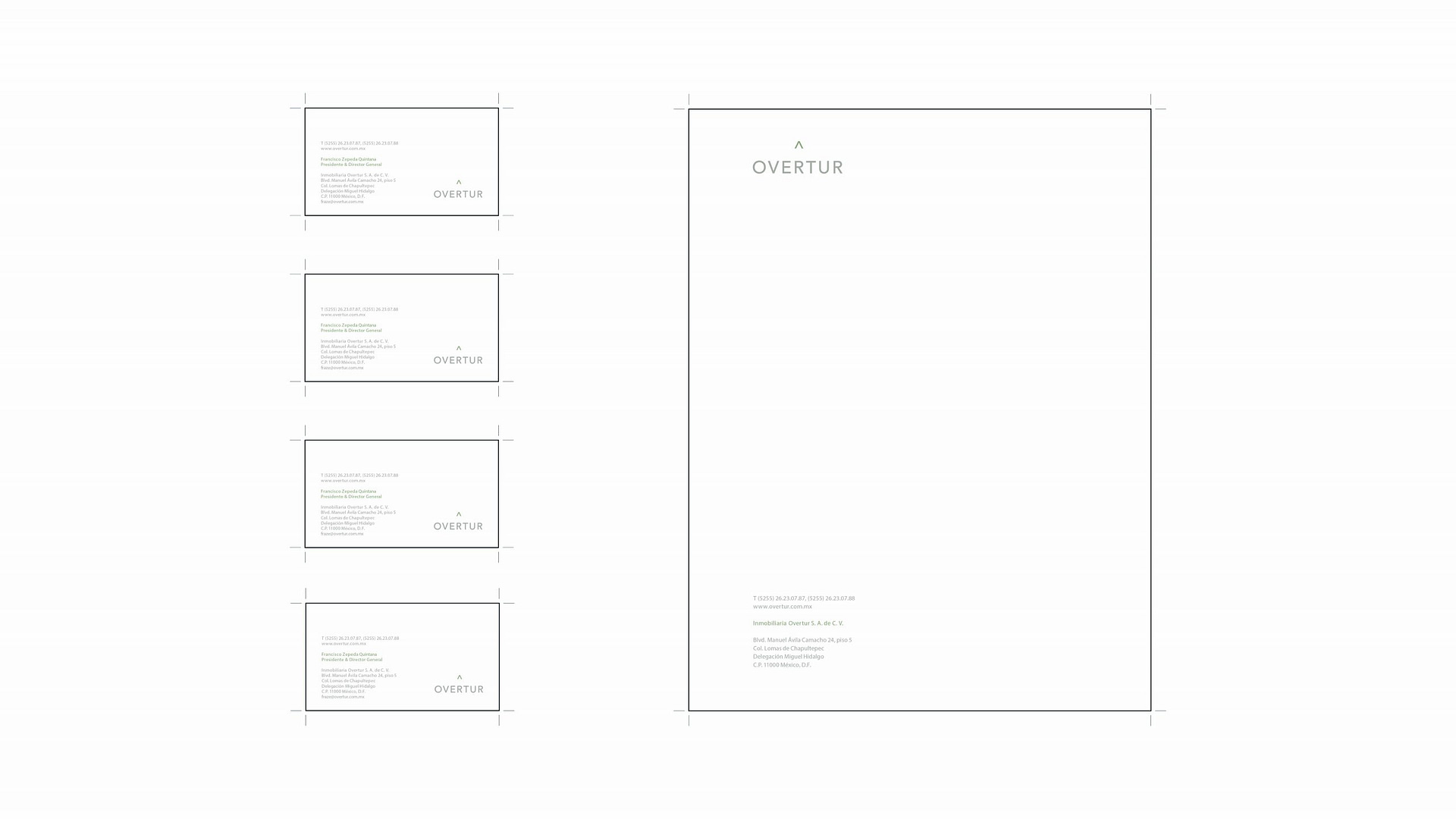 Overtur es una compañía dedicada a adquirir y desarrollar bienes raíces turísticos, comerciales, industriales y habitacionales. La empresa ha identificado oportunidades estratégicas de inversión, con un portafolio de proyectos situados sobre las costas del Pacífico, Golfo de México, el Caribe mexicano, así como en el centro del país. Se diseñó su identidad gráfica e hicimos las aplicaciones necesarias para su papelería.
