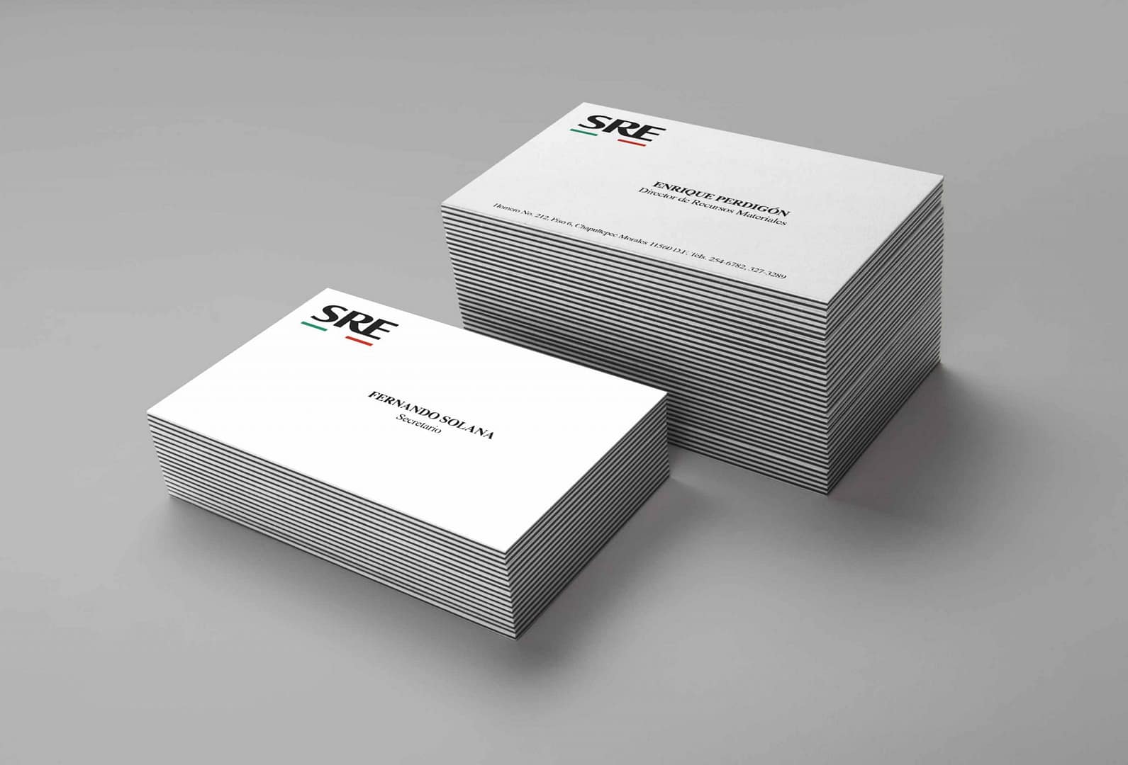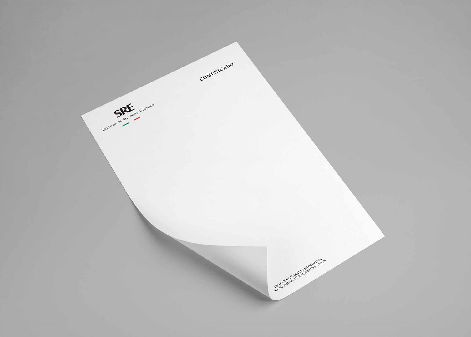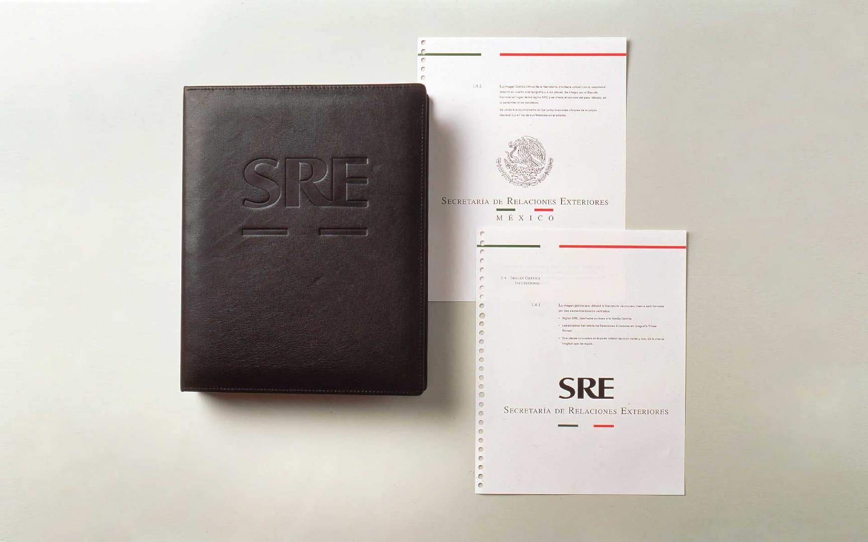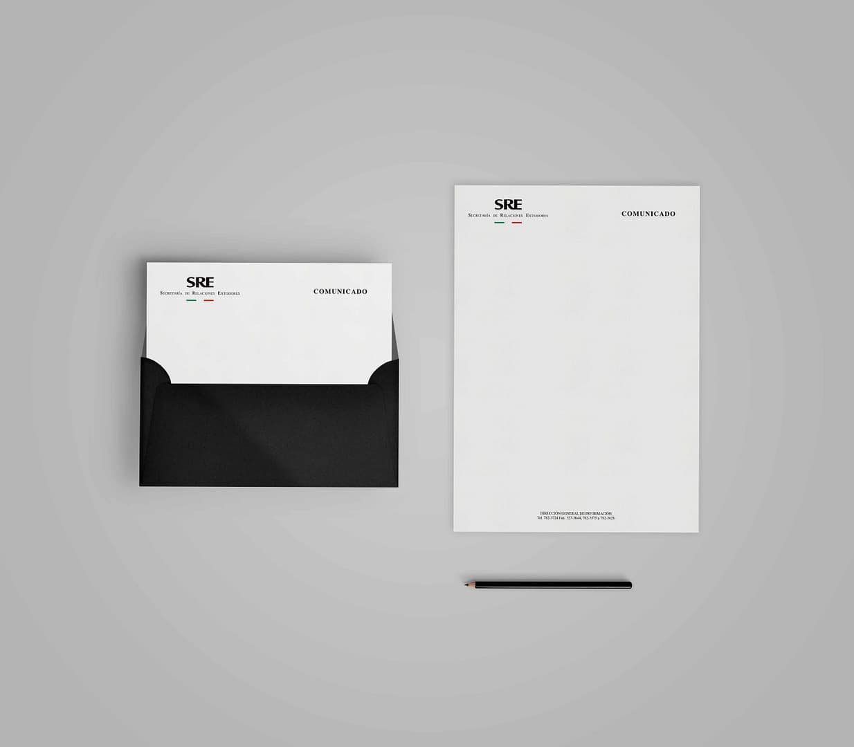 Para la Secretaría de Relaciones Exteriores trabajamos su identidad corporativa a nivel nacional e internacional, y decidimos unificarla con base en la utilización de la bandera. También llevamos a cabo aplicaciones para papelería y una guía de implementación.